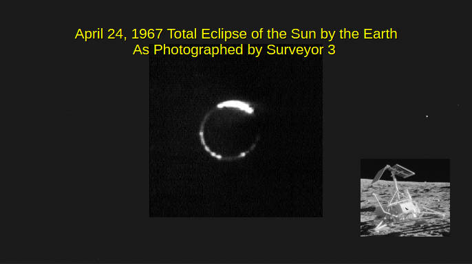 When we have a lunar eclipse, entities on the Moon see a solar eclipse. However, the Earth is 4 times larger than the Moon so that the totality of the solar eclipse lasts a long time, and the Earth covers much more than just the disk of the Sun. The Surveyor program was a lunar exploration program in preparation for the Apollo manned landings. Surveyor 3 landed on the moon just before a lunar eclipse, so one of its photographs was to look back at the Earth and take a look at it during totality of the solar eclipse. We know the Moon appears red, generally, when it’s eclipsed, and what Surveyor saw was the Earth with a red ring around it showing the combined sunrises and sunsets all around the earth at that time. The atmosphere of the Earth bends sunlight into the earth’s shadow. Blue light is scattered out, so we have red sunsets, and sunrises, so that is the color of the light that reaches the Moon. The amount of light we see on the Moon during totality depends on how clear the Earth’s atmosphere is at that time.
