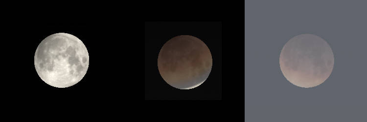 | 06:04 AM | Begin Totality. The expected dull red of the Moon will be brighter on the edge nearest the edge of the umbral shadow. How long will the totally eclipsed Moon be visible? |