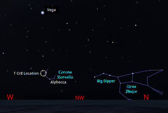 The small constellation of Corona Borealis, or Northern Crown appears about a third of the way between the bright star Arcturus, high in the south and the star Vega in the east. It is a small semicircle of stars with the brighter star called Alphecca near the center of the arc of stars. Sometime this year, we hope, another bright star will appear there. A nova of a dim star brightening about 1,600 times normal near that circle of stars. It has done it before. It has the designation of T Coronae Borealis (T CrB for short), and is a recurrent nova of a white dwarf star that suffers an explosion about once every 80 years. So this year we need to be looking out for that stellar explosion, which will be bright for only a few days, so one must be vigilant to spot it.