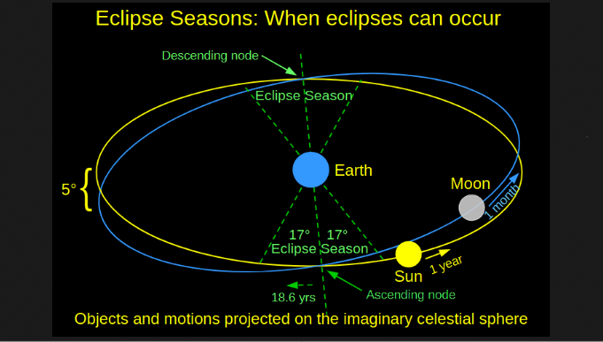 This morning there is an annular solar eclipse occurring. Don’t run outside to see it, especially if you’re here in northern Michigan. The eclipse is only visible in the Southern Ocean and Antarctica. However, this eclipse marks the beginning of an eclipse season, and we will have an eclipse that will be visible for our location in two weeks: a total lunar eclipse, which will be visible before sunrise on Tuesday morning, March 3rd. There are two periods were eclipses will occur in a year, with at least one of the sun and the moon. These periods are separated by a little less than six months, and last about 35 days. That’s about 5 1/2 days longer than a lunar month, so it is possible to squeeze in another eclipse, though not this time.