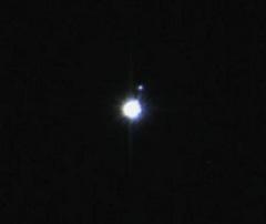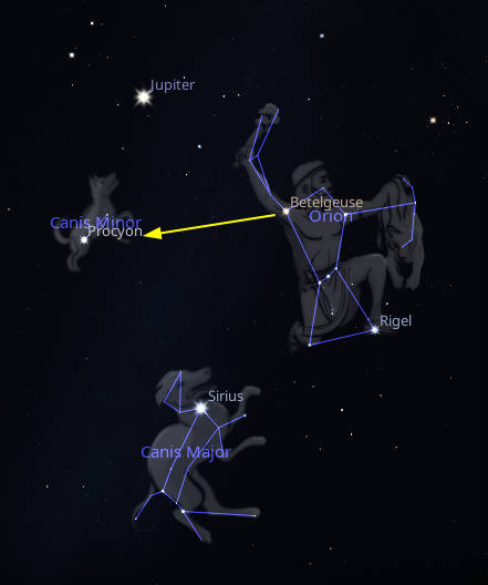 The star Procyon is in Orion’s little hunting dog, Canis Minor, which contains only one other star. It can be found by using the shoulder stars of Orion, Bellatrix and Betelgeuse, pointing to the left and down a bit to Procyon at 9 PM. With Jupiter above, Betelgeuse to the right and Sirius below, it makes an imposing diamond of stars. The word Procyon means “Before the Dog” meaning that rises before the Dog Star, Sirius, even though it is east of it. Procyon is also north of Sirius, which for observers above 30° north latitude, it does indeed rise before the Dog Star. It is a star like Sirius, though it’s not as bright, or white. Procyon is 11.5 light years away while Sirius is 8.6. Both have tiny white dwarf companion stars.
