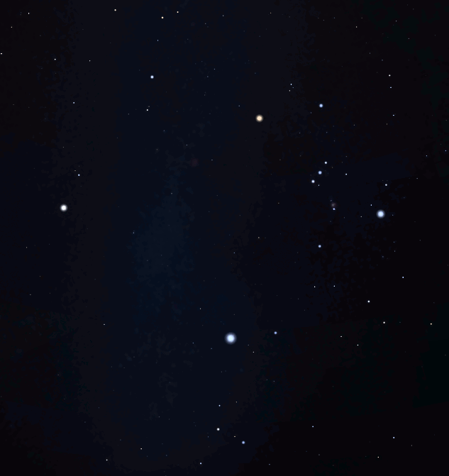 Orion’s two brightest stars are kind of the same but different. Let me explain. Betelgeuse is a red giant star, extremely massive, maybe 14 to 19 times the sun’s mass. It is somewhere between 8 and 14 million years old, which compared to the sun is just a baby, except it is so massive that it is in the last million or so years of its life. Rigel is a bluish white and a bit more massive, about 21 times the mass of the sun, and maybe 8 million years old. It has used most of the hydrogen in its core, and is beginning to transition into its final years which is a few more millions of years. So it’s not as far along in its evolution as Betelgeuse and has not bloated out and turned red. Betelgeuse is 500 light years away, while Rigel is almost 900.