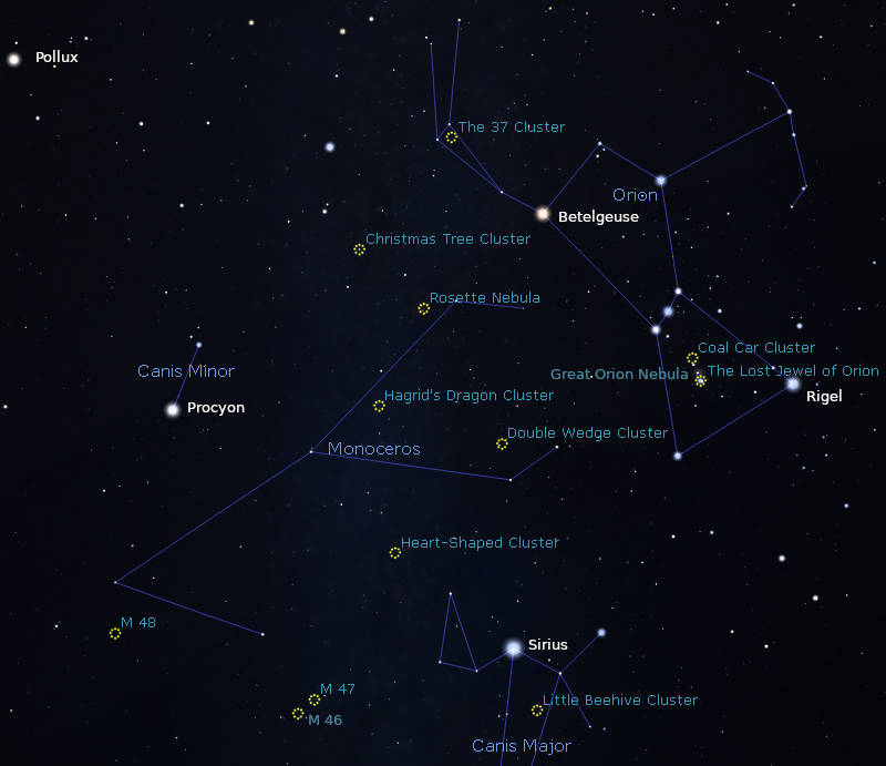 Among all the constellations in the sky of animals real and mythical, there is also a unicorn. It’s called Monoceros, and inhabits the southeastern sky at 8 p.m. mostly bounded by Orion on the right, Canis Major, the great dog below and Canis Minor, the little dog to the left and above. Unfortunately for observers without a telescope Monoceros, is devoid of any but the faintest stars. Maybe that’s why no one sees unicorns anymore. Though it lacks bright stars Monoceros is full of wonders revealed by telescopes and photography. A feast of faint nebulae or clouds of gas and dust, the birthplace of stars, including the red rose of the Rosette Nebula, and the more recently named Hagrid’s Dragon Cluster (NGC 2301).