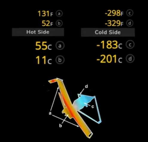 James Webb Space Telescope temperatures 16 days after launch. It looks like the cold side temperatures are dropping by 1 or 2 degrees Celsius a day. Credit: James Webb Tracker by The Launch Pad YouTube Channel. Data from NASA.