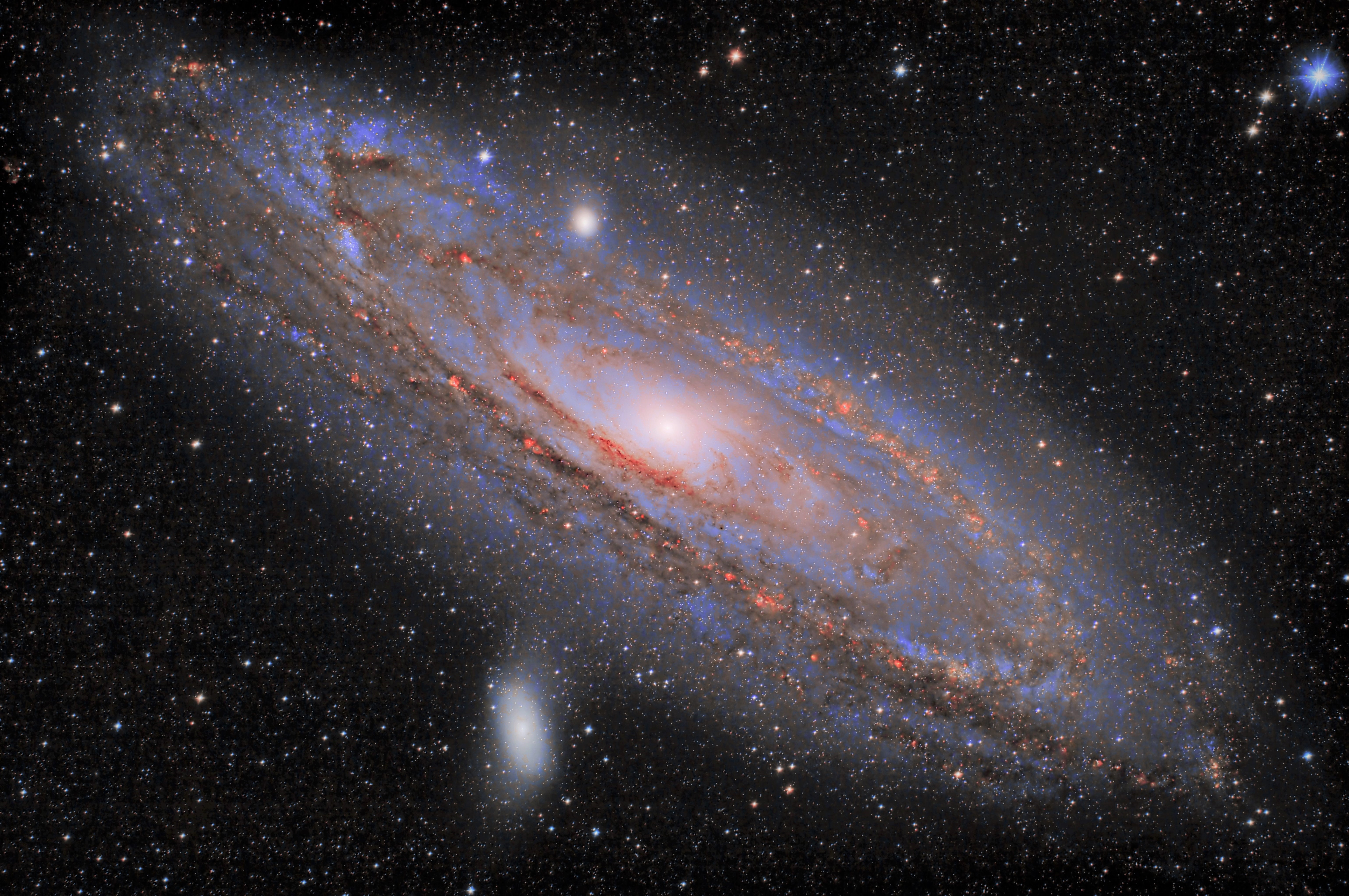 M 31, The Great Andromeda Galaxy. This image really shows the red H II Regions intermixed with the dark dust lanes that delineate the galaxy’s spiral arms. H II or ionized hydrogen regions are illuminated by hot young stars that were born within them. Click on the image to enlarge it. Credit: Dan Dall’Olmo.