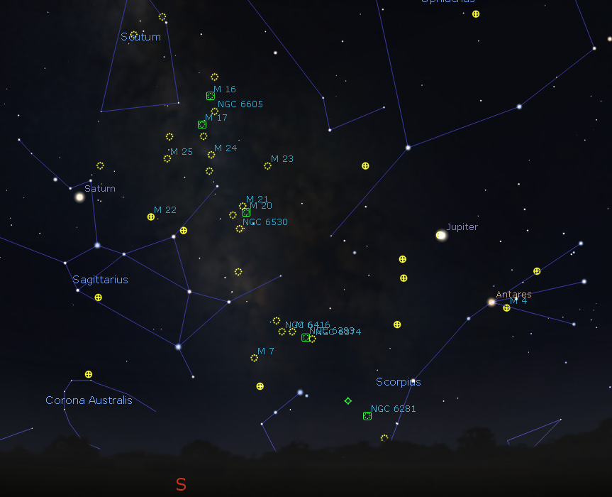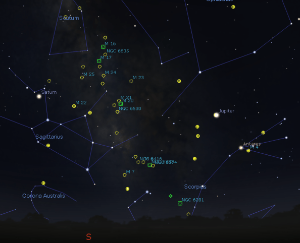 The sky around Sagittarius and Scorpius at 10 p.m. August 22, 2019. The objects noted will appear as fuzzy objects in binoculars. Dotted circles are open or galactic star clusters which are easily resolved in small telescopes. Crossed circles are globular star clusters, which require larger telescopes to resolve. Squares are emission nebulae, bright clouds of gas, illuminated by the young stars born within them. Click on the image to enlarge. Created using Stellarium.
