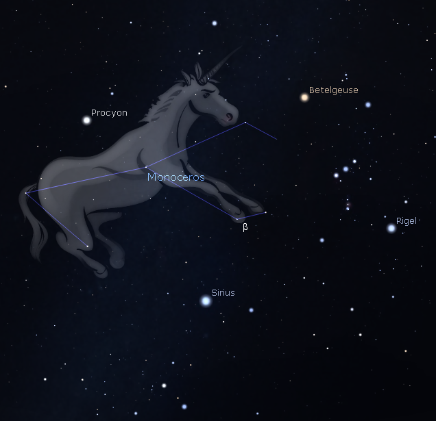 Monoceros the unicorn seen mostly inside the Winter Triangle of Betelgeuse, Sirius and Procyon. Note the star in the unicorn’s right hoof denoted with a funny B. That’s Beta Monocerotis,a triple star visible in small telescopes. Created using Stellarium with additions.