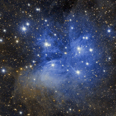 The Pleiades are so large that most telescopes will not allow one to see all the brighter stars at once, so binoculars are the best way to view them. At a dunes star party a few years ago, before COVID, I used my 11-inch (279 mm) Newtonian telescope, which has a 55 inch (1,397 mm) focal length, with a 40 millimeter eyepiece to view the Pleiades. A 40 millimeter eyepiece in that scope gives too low a magnification to use the entire diameter of the primary mirror. All the light doesn’t make it into the eye. That eyepiece gave me about 35 times magnification, so the main stars of the cluster fit into the field of view. The photograph above is nice and all that, but looking with the eye visually at the Pleiades, even with binoculars, you’ll notice something quite different from the photographs. In photographs to make a star brighter you make it bigger. But the eye has a much greater dynamic range. The stars are incredibly brilliant blue white-points of light in the case of the Pleiades. Absolutely beautiful, much more beautiful than any photograph. Not to disparage photographs, but photographs can do what the eye cannot. That is, store light to bring out very faint objects and details. So, let’s take a final look at the Pleiades in a photograph by GTAS member Dan Dall’Olmo.