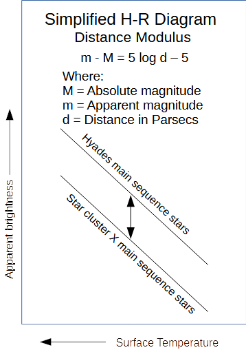 The Hyades is also important in astronomical history in that it helps us measure distances to more distant star clusters. The Hyades was the only star cluster close enough to measure its distance by the parallax method before the advent of the European Space Agency’s Hipparcos and Gaia satellites. If one matches stars on the Hertzsprung-Russell diagram of intrinsic brightness versus surface temperature with other star clusters the stars of the main sequence, where stars spend most of their lives burning hydrogen. The difference in the brightness of the main sequence stars gives the measure of how other star clusters measure up as far as distance since the main sequence is a relatively narrow distribution of stars. This works only with star clusters because there are many stars at the same distance which happen to be about the same age. And enough stars to establish the main sequence since stars at later stages of life may have the same temperature, but vastly different brightnesses.