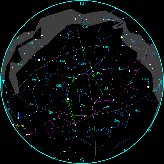 - QuadR on the star charts is the radiant of the Quadrantid meteor shower which peaks on the 4th at 3:20 a.m. EST (8:20 UT).