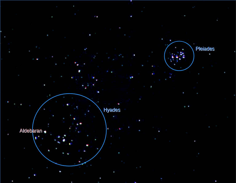 On the previous page is a family portrait of the Pleiades and Hyades. Yes, family portrait. In Greek mythology, the Hyades are the half sisters of the Pleiades. The god Atlas is their father, Pleione seems to be the mother of the Pleiades, and Aethra is the mother of the Hyades. In astronomical terms the Hyades would then be the older sisters of the Pleiades.