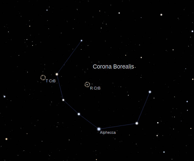 Corona Borealis’ other famous variable star is R Coronae Borealis, a star that’s normally about 6th magnitude that irregularly dips down to 10th or even dimmer. The mechanism for this appears to be that the star is surrounded by clouds of dust that periodically block it from our view.