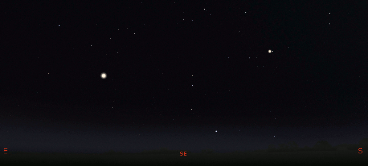 There’s a bright star that appears for only seven and a half hours on autumn evenings. It’s appearance, low in the south-southeast at 9 p.m., is a clear indication of the autumn season. The star’s name is Fomalhaut, which means fish’s mouth. That’s fitting because it’s in the constellation of Piscis Austrinus, the southern fish. At our latitude it’s kind of the fish that got away, because Fomalhaut appears to be quite alone low in the sky. The other stars of its constellation are dim, and being low in the sky makes them even dimmer. However, this year Fomalhaut has visitors. Above and left of it is the brilliant planet Jupiter. And above and right of it is the bright planet Saturn. Both planets, while not very close to Fomalhaut, will keep it company this year.