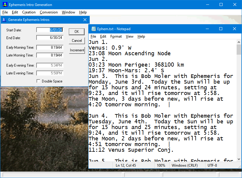 This is a text file produced by the Intro generated function of the Ephemeris Helper program. This file is pasted into the Ephemeris document, where I add the rest of the content. The dates with no intros are Saturday and Sunday. I also use two more files of astronomical events, which I add after the intros to help me with program topics. The intro has two formats, depending on whether the Sun rises before or after the start of the last airing of Ephemeris that day.