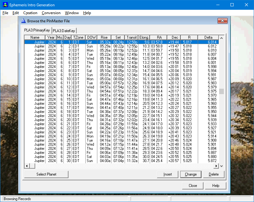 My Ephemeris Helper program massages the raw data from the above program to create this Almanac Master table.