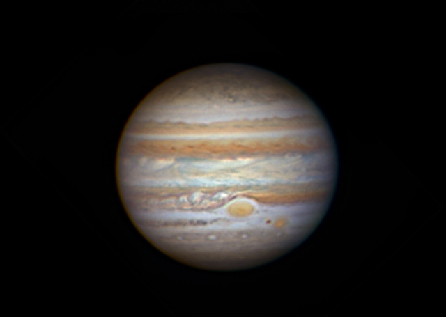 Even in small telescopes Jupiter shows some detail. The larger the telescope in diameter the more detail can be seen. It also depends on what astronomers call seeing, or the steadiness of the atmosphere. The easiest detail to spot are the parallel brown and cream-colored cloud bands. These run in the direction that Jupiter’s moons move, since the four Galilean moons orbit over Jupiter’s equator. Jupiter, 11 time’s the Earth’s diameter, rotates on its axis in a bit less than 10 hours, though the clouds at the equator rotate faster than those at higher latitudes. It also gives Jupiter a slightly squashed appearance., enhanced by the horizontal stripes. Embedded in one of the dark stripes is the famous Great Red Spot.