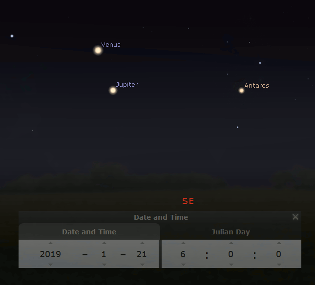 01/21/2019 – Ephemeris – Venus and Jupiter will pass each other tomorrow morning
