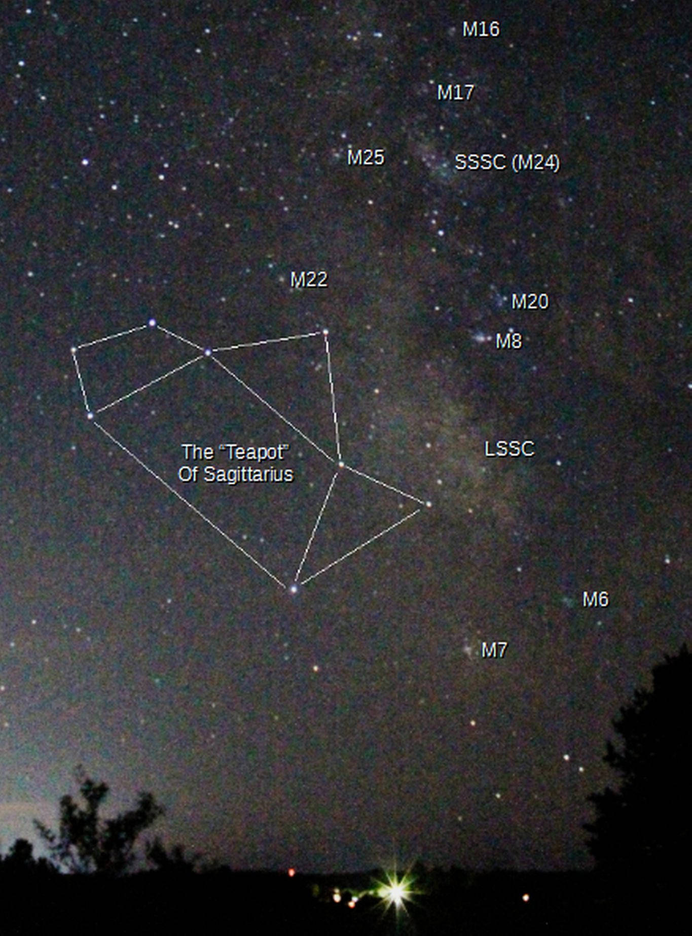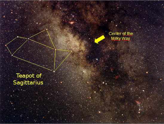 Behind a dark cloud in the Milky Way, just above the spout of the teapot asterism or informal constellation that we see of the zodiacal constellation of Sagittarius, lies the very center of our Milky Way Galaxy. It cannot be seen in visible light, but can be detected with radio waves and infrared light that can penetrate the clouds of dust between. In 1932 Bell Laboratory physicist and radio engineer, Karl Jansky, discovered a source of radio static that came from that region of sky. It was subsequently given the designation Sagittarius A. It turns out that within that source there is an object called Sagittarius A* (Pronounced Sagittarius A Star), invisible in the near infrared, but with the mass of four million suns. It was recently imaged as the black hole at the center of our galaxy.