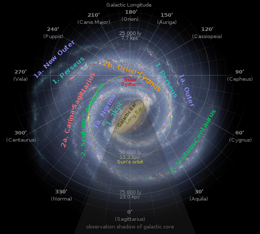 Our place in the Milky Way. Note that we appear to be in a barred spiral galaxy. The arms are numbered and named. 3kpc is the 3 kiloparsec arm. 3kpc = 9,780 light years. The Sun is about 27,000 light years from the center. Credit NASA and Wikimedia Commons, via EarthSky.org