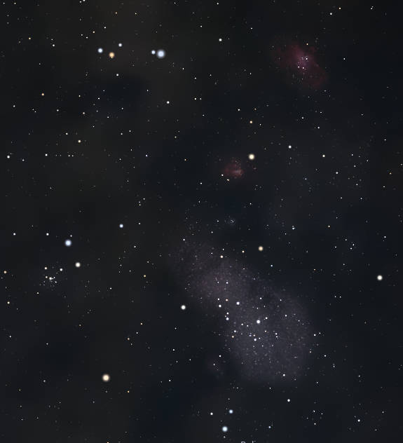 In the southern sky between the Teapot of Sagittarius below and Aquila the Eagle above, with Altair the southernmost star of the Summer Triangle, lies Scutum the shield of John Sobieski the Polish king who stopped the advance of the Turks at Kalenberg in 1683. The Polish half of me is very proud. Scutum is one of two official constellations which are related to real persons. The other one is Coma Berenices, a hank of the Egyptian Queen Berenice’s hair. However, the stars here are so dim and embedded in the glow of the Milky Way as to be nearly impossible to discern. Scutum lies in one of the richest portions of the Milky Way, wonderful to scan with binoculars and telescopes for star clusters and nebulae, clouds of dust and gas.