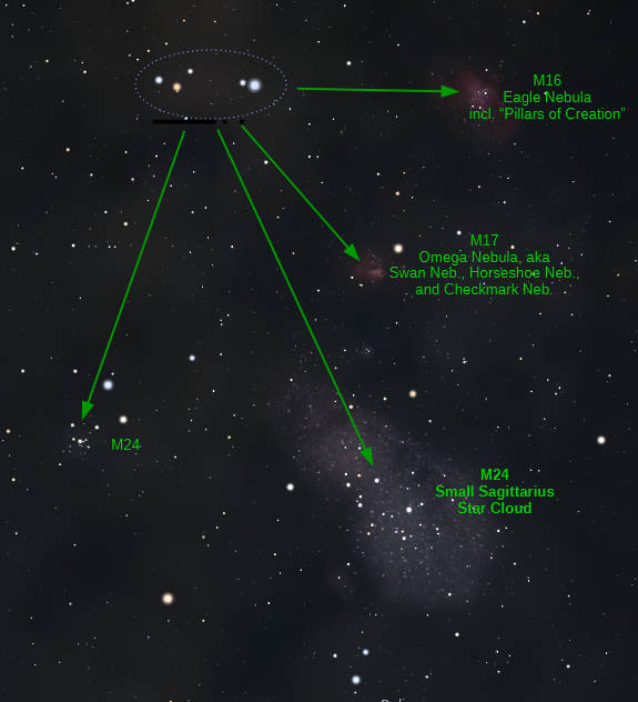 In the image above the amount of detail of the stars is approximately that of a pair of binoculars. The various nebulae and star clusters are denoted with M numbers. These are some of the brightest, what we call deep sky objects, in the catalog by Charles Messier, who is looking for comets. He numbered them as he came across them. The brightest star cluster is M7, which Claudius Ptolemy recorded in the 2nd century CE. The brightest nebula is M8, the Lagoon Nebula out of which a star cluster is being formed. In binoculars, it looks like a short horizontal gash. Next in brightness is M17, a fuzzy spot in binoculars, but appears as a glowing check mark, or swimming swan in a telescope. M20, the Trifid Nebula, is the next brightest nebula in which dark dust lanes divide it into three lobes. M16, the Eagle Nebula is very dim. Most of the time I miss the nebulosity, but its embedded star cluster is quite easily seen. The rest of the Messier objects are star clusters or a star cloud. Of these M22 is a globular star cluster and one of the easiest of these clusters to resolve, though it might take a telescope of 150 mm (6″) diameter to do it.