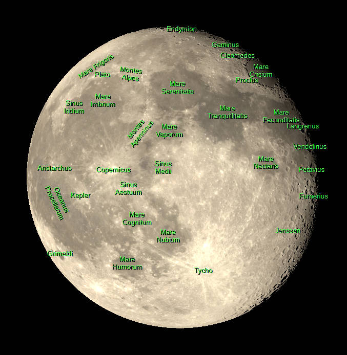 The full Moon tonight, November 5, 2025. A view visible in small telescopes showing an image with and without selected features labeled. Created using Stellarium, LibreOffice Draw, and GIMP.