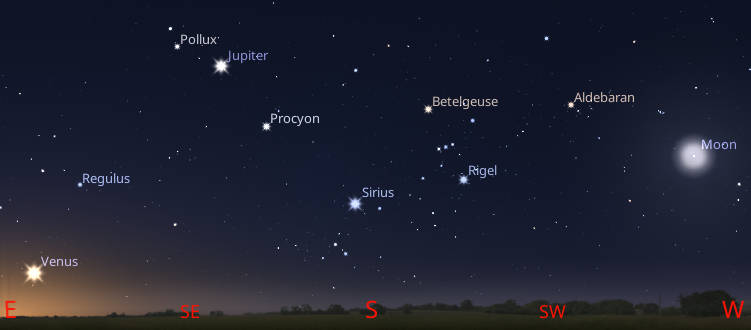 Venus and Jupiter are visible in the southeastern sky among the winter stars at 7 AM tomorrow morning.