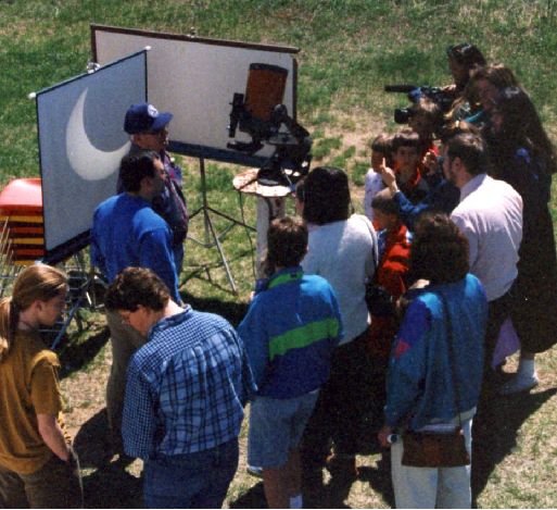 Pinhole projection is an easy way to project the Sun’s image. Depending on how far you want to project the image the larger the pinhole the farther and larger (and dimmer) the image can be. “Pinholes” up to 1/4 inch and maybe even half an inch can be used if you’re projecting it 10 feet or more. One can even use a mirror in an envelope with a small hole punched in it with the paper punch to project the sun’s image on the shady side of a building. That way many people can view the eclipse safely. Also try different size holes to get the best combination of size and brightness of the image. Unlike the illustration above it is best to mount the mirror on a tripod, or other support somehow, rather than holding it to keep the image steady. Using this method, the Sun’s motion due to the Earth’s rotation can be seen. Also, large sunspots may also be visible.