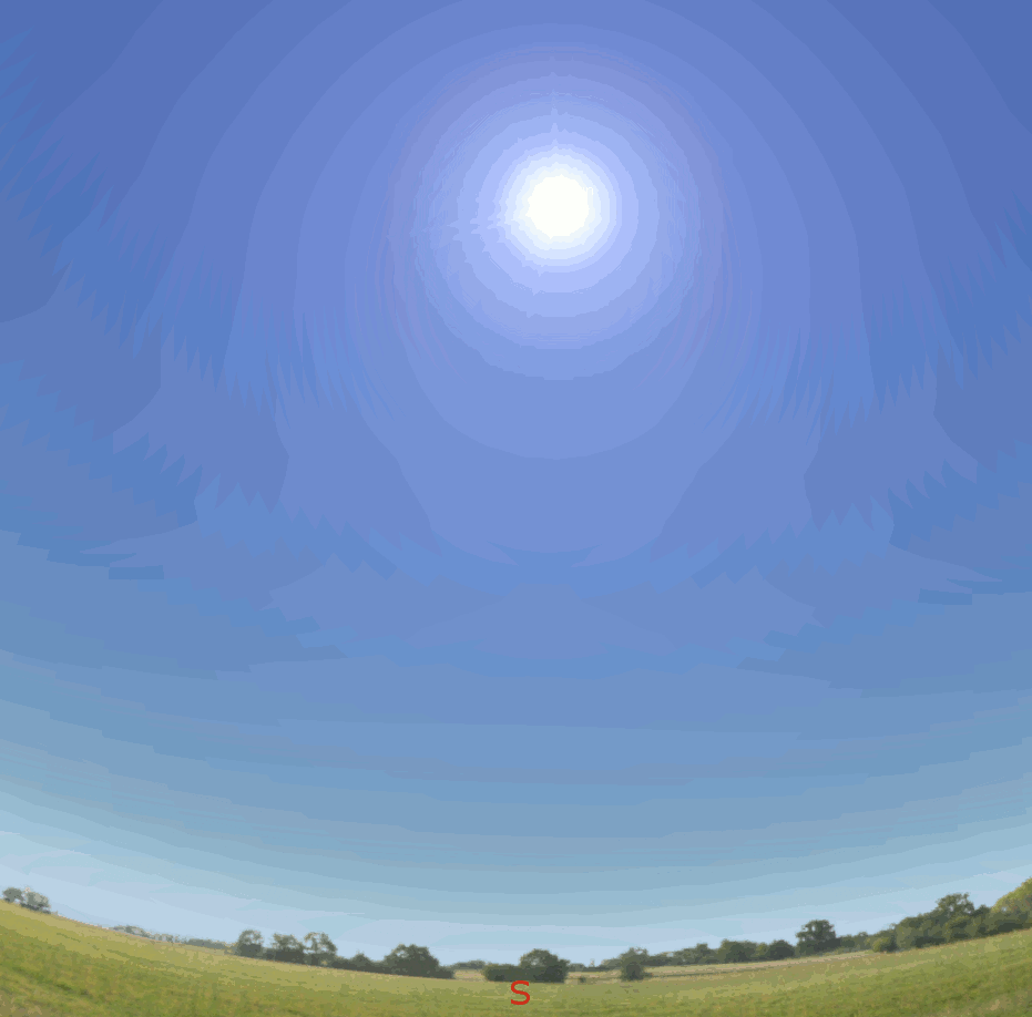 Comparing the sun’s path at the summer and winter solstices. This is a stereographic representation of the whole sky which distorts the sky and magnifies the size of the sun’s path near the horizon.