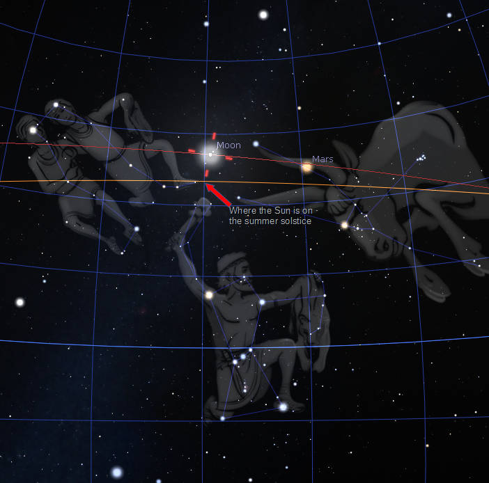 The Moon near the summer solstice point overnight tonight at 1:15 am (the 9th). The sky is overlaid with the equatorial grid. The bright blue line that runs just above Orion’s belt is the celestial equator. The declination lines match Earth’s latitude lines are 10 degrees apart. The vertical blue lines are right ascension lines, like earthly longitude lines, and are 15 degrees apart. Each one represents one hour. The orange line is the ecliptic, the path of the Sun in the sky, also the plane of the Earth’s orbit. The red line is the Moon’s orbit, which is inclined by about 5 degrees to the ecliptic. Click on the image to enlarge it. Created using Stellarium and LibreOffice Draw.