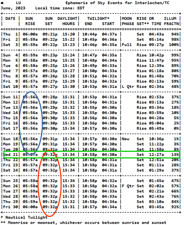 06/15/2023 – Ephemeris – Today we have the earliest sunrise of the year