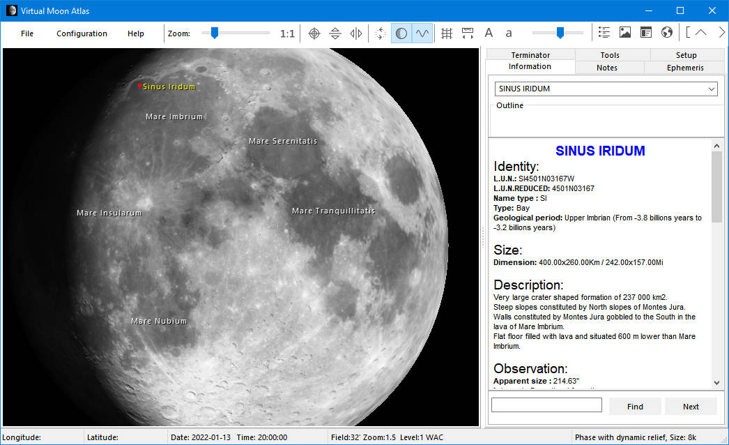 This is a great guide to the Moon called Virtual Moon Atlas for a computer, showing the Moon for any date and time. It’s a free app which runs natively on Windows, but also can run with emulators on Linux and macOS. I find it to be an amazing program. Check it out under Free Astronomical Software on the right of this page.