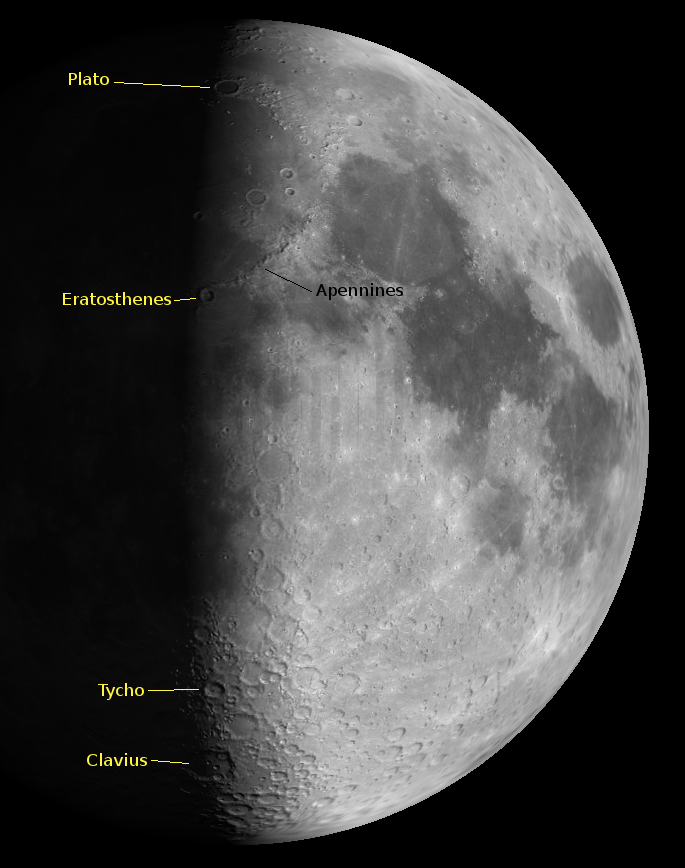 Tonight on the moon there are some very prominent craters on the terminator or sunrise line that’s cutting the moon in half. From the top or north of the moon there’s Plato, which is also called a ringed plain because it has a flat floor. South of there is Eratosthenes, at the end of the arc of the Apennines mountain chain. At the south or bottom end of the moon are two other of my favorite craters. First is the crater Tycho, that doesn’t look spectacular now, but will when the Moon is full with its rays of ejecta crossing a long way across the face of the moon. A little bit farther south, partially entering sunlight is the large crater Clavius. On my blog, bobmoler.wordpress.com, I’ll illustrate what the Moon’s image looks like in different types of telescopes.