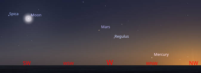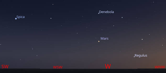 Let’s take our weekly look at the whereabouts of the naked-eye planets. The Red Planet Mars, will be seen to the upper left of the bright star Regulus in the constellation Leo the lion. Both are seen low in the western sky by 10:30 PM at least. Mars is moving away from Regulus, close to the horizon in the west-northwest toward Spica, higher in the southwest. Mars moves much faster against the background stars than the more distant Jupiter and Saturn. Jupiter is in the morning sky now very low in the east-northeast by 5:15 AM. Venus will rise at 3:23 AM in the east-northeast, and by 5 AM will be seen in the east, as the Morning Star. By then Saturn will be in the south-southeast, and below the last quarter Moon tomorrow morning.