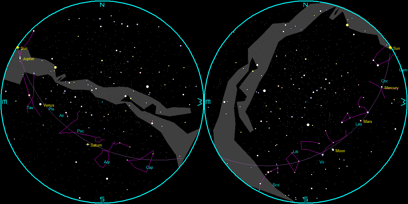 Note, the chart times of 11 p.m. and 4 a.m. are for the night of the15/16th. For each week before then add ½ hour (28 minutes if you’re picky). For each week after then, subtract ½ hour or 28 minutes. The planet positions are updated each Wednesday on this blog. For planet positions on dates other than the 15th, check the Wednesday planet posts on this blog for their weekly locations.