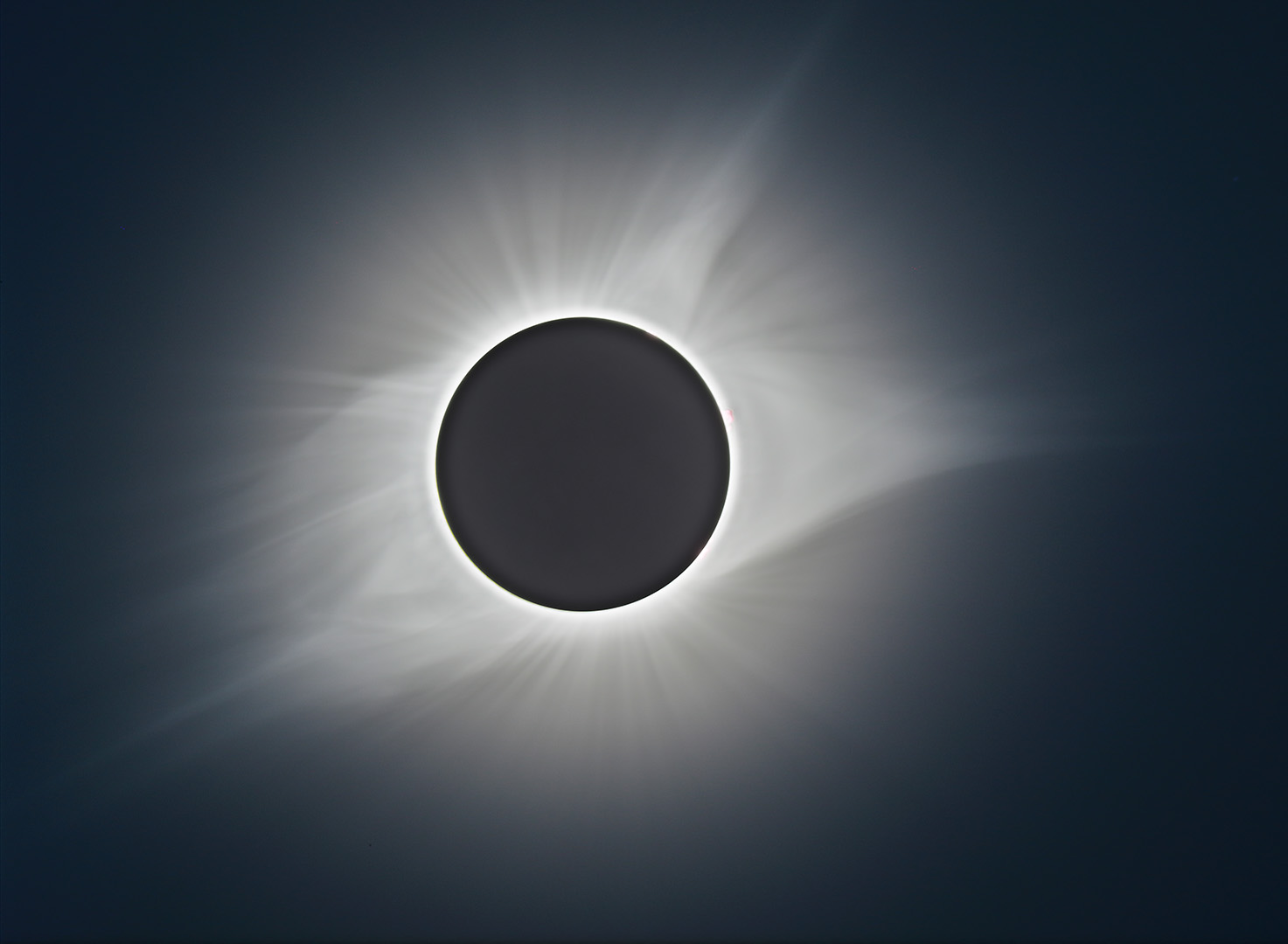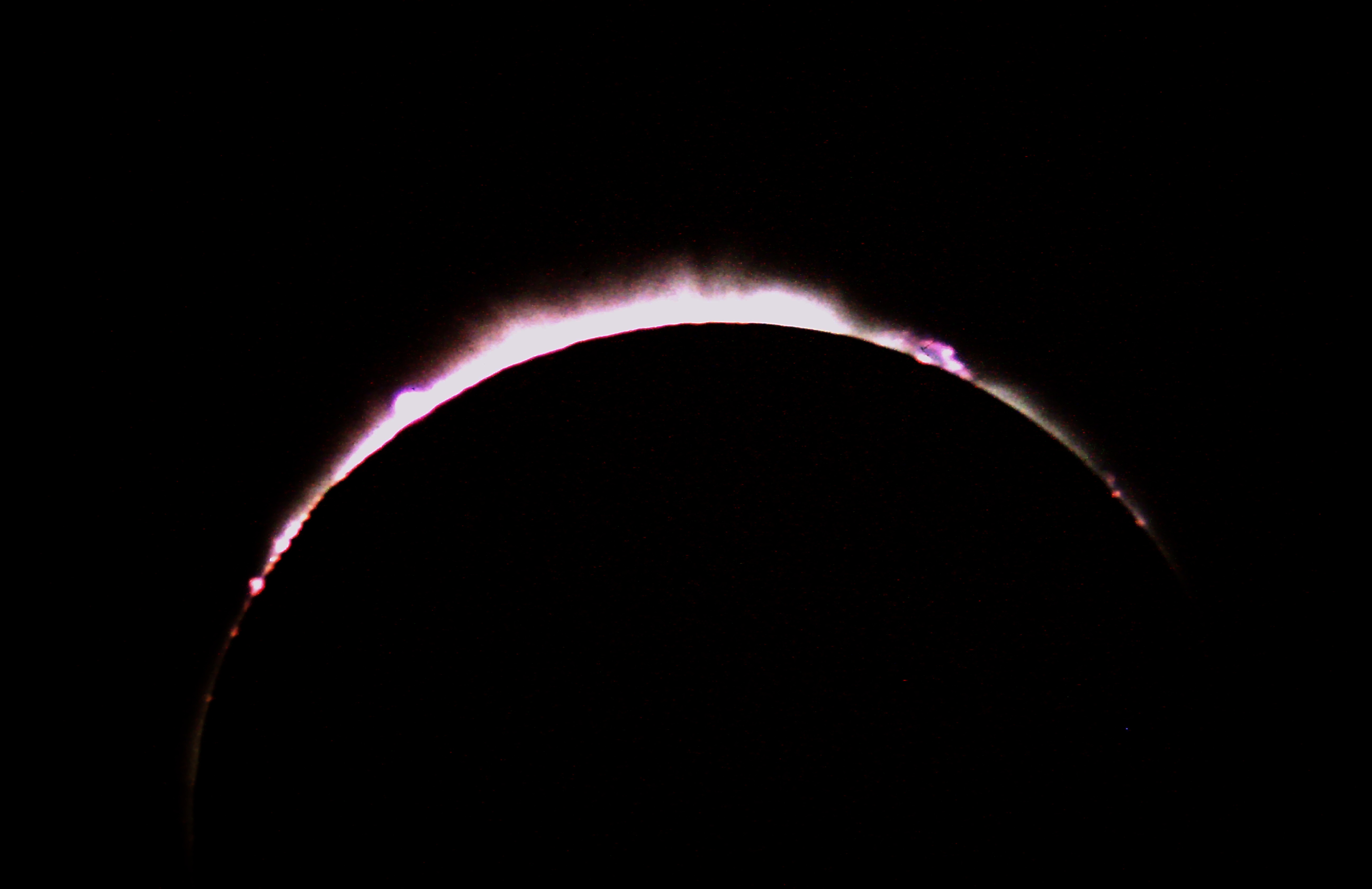 The outer three layers of the Sun are potentially visible to us: photosphere, chromosphere, and corona. The photosphere is the bright ball of the Sun we normally see. Looking at it for any length of time will cause blindness. Never look at the Sun’s photosphere without an approved solar filter. The other two layers can be seen during the totality of a solar eclipse. A thin red layer of gas with flame-like protrusions called prominences just above the photosphere and can normally be seen in a Hydrogen Alpha solar telescope, but easily seen in binoculars just after totality starts and before it ends. The corona is a silvery white extended solar atmosphere that can be seen out to several solar radii out from the edge of the Moon. Its shape changes hour to hour, and sometimes minute by minute.