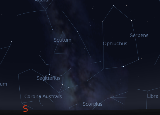 Low in the south at 10:30 PM shines the heart of summer Milky Way. The constellation that’s seen there is Sagittarius which is supposed to be a centaur with a bow and arrow. We modern folk haven’t seen a centaur outside a Harry Potter movie, so we see its stars looking like a teapot, a short and stout little teapot like in the children’s song. It is tipped to the West with the Milky Way like steam rising from its spout, which is about to pour its tea on the southwestern horizon later tonight. Sagittarius is just begging to be explored with binoculars or a very low power telescope to see its myriad of stars, star clusters and nebulae. As fabulous as all this appears, we cannot see into the heart of the Milky Way for all the clouds of dust in the way.