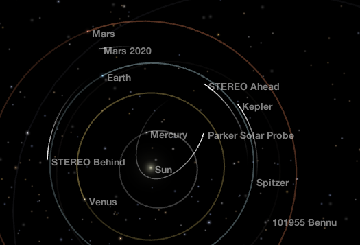 Inner Solar when OSIRIS REx took its sample from Bennu. Bennu’s official designation is 101955 Bennu. The number designation is the consecutive number it is given when placed on the official list of asteroids and dwarf planets when its orbit is determined. Notice that it was on the other side of the Sun. Credit NASA’s Eyes app.