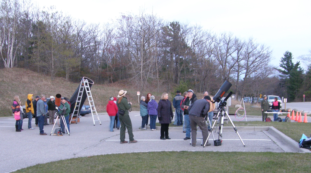 A group of folks out to see the planets with the member’s and society’s telescopes. Credit staff of the Betsie Valley District Library. Note: The blob isn’t the Moon or a UFO, but an out of focus bug caught in the flash.