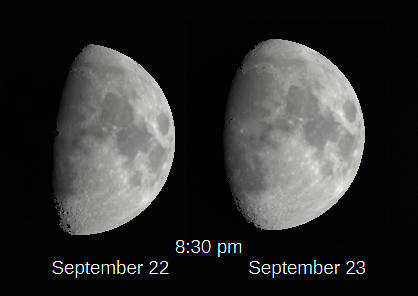 This is Ephemeris for Friday, September 22nd. Today the Sun will be up for 12 hours and 10 minutes, setting at 7:40, and it will rise tomorrow at 7:30. The Moon, at first quarter today, will set at 11:45 this evening. | Tonight, if it’s clear, members of the Grand Traverse Astronomical Society will hold a twilight talk and a star party at the Betsie Valley District Library in Thompsonville, MI. It starts at 7 p.m. with a talk about the upcoming solar eclipses by member Dan Dall’Olmo. There will be a minor partial solar eclipse next month on the 14th, and a much greater partial eclipse April 8th for our area. The total part of the April eclipse can be seen less than a day’s drive away in mid-Indiana and northern Ohio. If tonight is cloudy the star party will be postponed to tomorrow. Featured will be the Moon and some of the stars of the waning nights of summer. (It’s looking like Saturday night might be the better night, but we’ll see. A decision can be made as late as 5 pm the day of the event) The season of fall starts tomorrow at 2:50 am with the autumnal equinox.