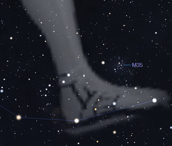 The constellation of Gemini the twins can be seen high in the south at 8 pm tonight. It’s located above and left of the constellation of Orion. The two brightest stars at the upper left of the constellation have the twin’s names. They are Castor, the one to the upper right and Pollux the brighter one to the lower left. I tend to see the constellation as the two lines of stars from Castor and Pollux running down toward Orion as a silhouette of these two boys standing together. Others see them as two stick figures. At the bottom of the line of stars emanating from Castor, what I consider Castor’s foot, is a lovely star cluster which is visible in binoculars as a little fuzzy spot, but a telescope will show a great number of stars here called Messier 35 or simply M35.