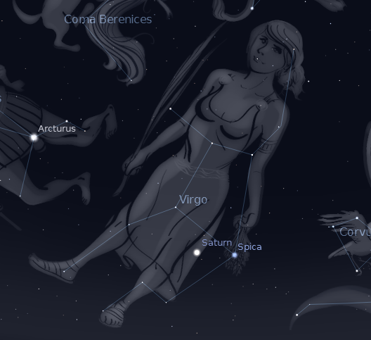 Tonight in the sky: to the left of the constellation of Leo the lion, which lies in the south at 10 p.m. is the next constellation of the zodiac: Virgo the virgin, seen in the south southeast.  Virgo is a large constellation of a reclining woman holding a stalk of wheat.  The bright star in the center of the constellation, Spica, is the head of that spike of wheat; and as such ruled over the harvest in two of Virgo’s guises as the goddesses Persephone and Ceres.  The planet Saturn is also in Virgo this year to the left of Spica.  Virgo is also identified as Astraea the goddess of justice.  The constellation of Libra, the scales, is found just east of her a couple of hours later, not yet risen at 10 p.m.  Early Christians saw Virgo as the Virgin Mary.