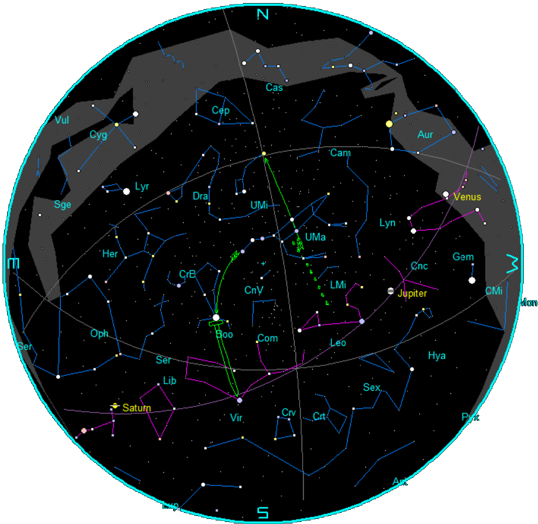 Star Chart for May 2015. Note the Milky way in the north. The Coma Berenices cluster is located between the labels CnV and Com. Created using my LookingUp program.