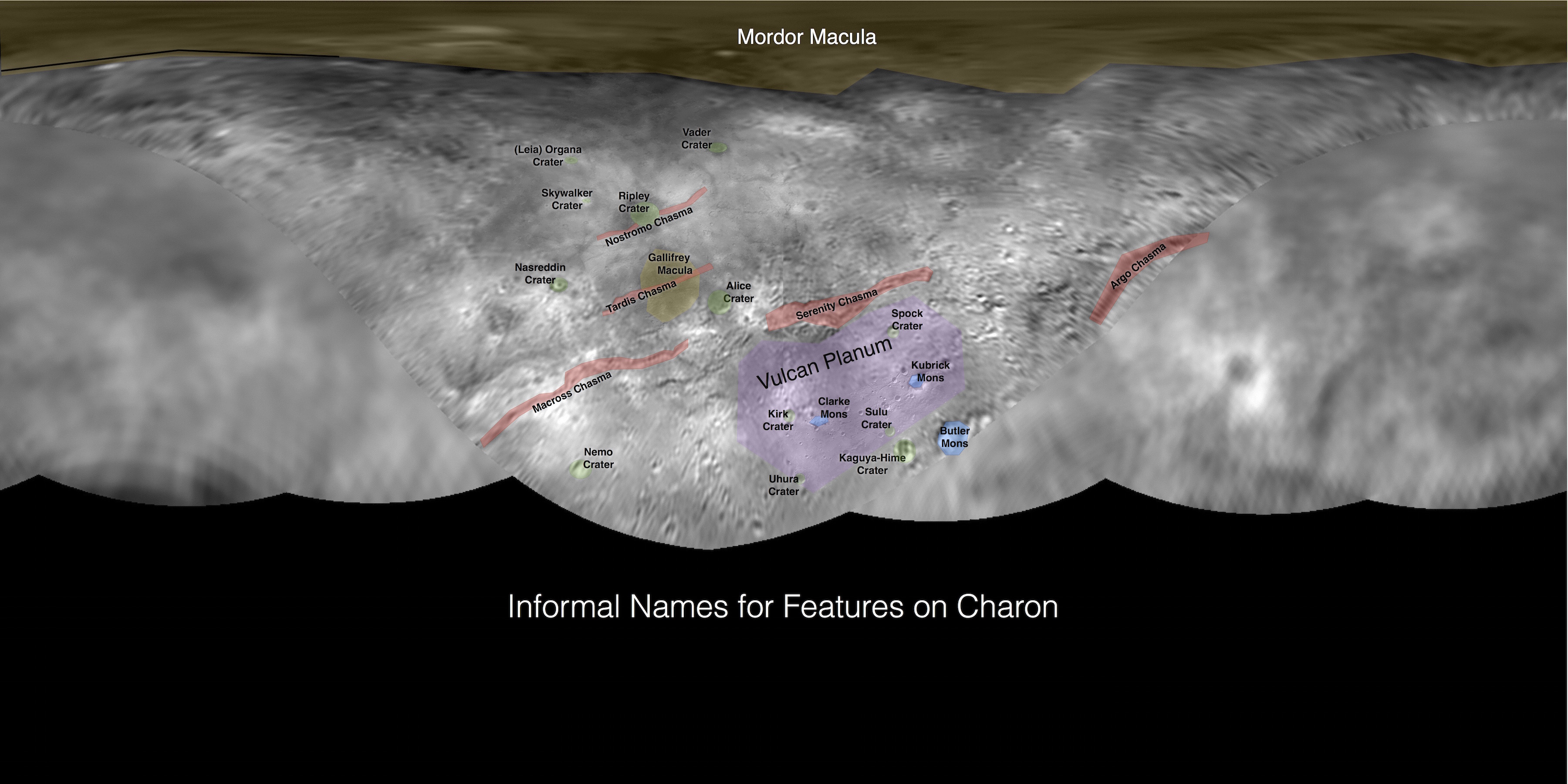 The New Horizons team is downloading data now from all the instruments gathered from the encounter with Pluto, but in mid-September the pictures again will be flowing down to Earth. What was downloaded in the day and a half after close encounter with Pluto were highly compressed images of an area of Pluto and Charon’s surface showing a wider view than we will see later on and in full resolution. The team is already beginning to name the features that can be seen in sufficient detail. The International Astronomical Union has decided the types of names for Pluto, Charon and the rest of the Satellites. Pluto is set aside for explorers, both human and robotic. Charon, for mythical and fictional space and adventure heroes, vessels and authors.