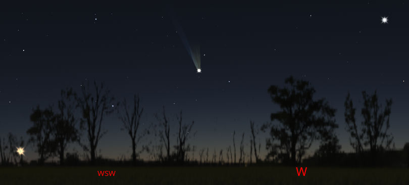 The comet will pass almost directly between the Earth and the Sun on the evening of the 9th. It’ll be about halfway between the Earth and the Sun at that point. It should be picked up by the Solar and Heliospheric Observatory satellite (SOHO) which is orbiting the Earth-Sun L1 Lagrange point a million miles sunward from the Earth with its C3 coronagraph*. Then the comet’s tail should be pointing almost directly at the Earth. As the comet swings out away from the Sun it will also be more rapidly moving away from Earth. This is because the comet has an orbit that is counter to that of the orbits of the Earth and the rest of the planets around the Sun and will rapidly fade as it increases its distance.