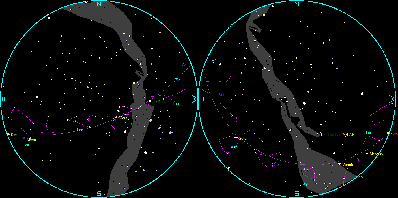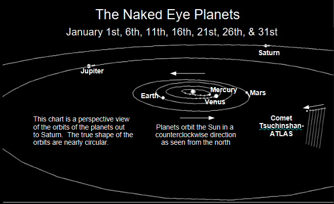 Let’s take our weekly look at the whereabouts of the naked-eye planets. Venus might be spotted in the West southwest only 7° above the horizon at 8 PM, 55 minutes after sunset. It will set at 8:23. Saturn will be in the southeast at that time. Saturn may look disappointing in telescopes this year since its rings are nearly edge on and appearing as a line through the planet like it’s stapled onto the sky. Jupiter and Mars will be up in the morning sky, with Jupiter rising about 10:08 PM in the east-northeast. By 7 AM tomorrow, Jupiter will be brighter than any of the winter stars high in the south. Mars, with its reddish hue, will be to the left of Jupiter. Comet Tsuchinshan-ATLAS will be in the western evening sky starting this weekend. It is expected to be quite bright, I’m betting with a broad tail.