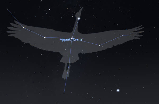 Yesterday I looked the star in the beak of the constellation of Cygnus the swan and the informal constellation or asterism made from most of its stars the Northern Cross. Cygnus is the official International Astronomical Union constellation name. However, the indigenous Anishinaabe people of our area had another bird in mind when seeing these stars, which are now fairly high in the east in the evening: Ajijaak, (pronounced a-ji-jock) a Sand Hill crane. While the swan is flying, neck outstretched to the south through the Milky Way, the crane is flying northward with its long legs trailing behind. The bright star Deneb is at his head. Where I live I see more cranes than swans these days and hear their creaking-door-like calls, and see a pair from time to time in a field south of where I live.
