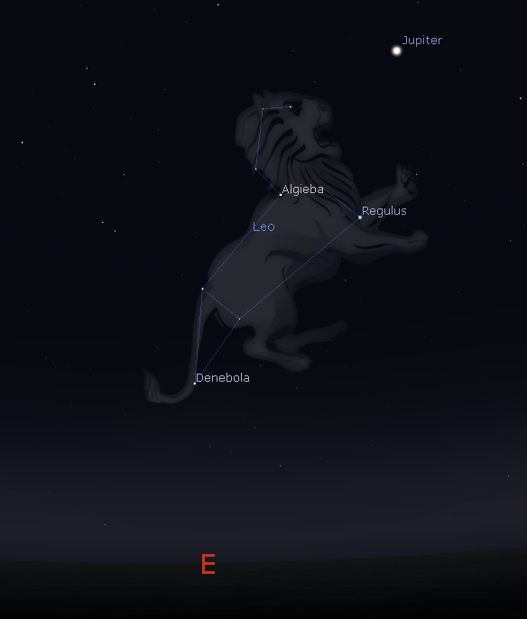 The constellation Leo the lion is now rising in the east at 9 pm. It’s below and left of the Big Dipper higher up in the east-northeast. Leo is marked by two sets of easily recognizable stars. The front of him is a backward question mark of stars, also known as the Sickle that mark his head and mane, along with the front part of his body. Regulus is the star at the bottom of that backwards question mark. It’s the Little King Star. Jupiter this year is above right if it. The hind end of him is a triangle of stars ending with another bright star, but not as bright as Regulus. It’s Denebola which means Lion’s tail. It is thought when the sun was in this constellation long ago that the lions were driven by the heat to quench their thirst in the Nile river. Ancients physicians thought medicines were poison when the sun was here too.