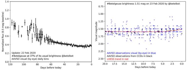 The brightness of Betelgeuse from late November 2019 to 23 Feb. 2020 shows it dimming dramatically (the y-axis is in magnitudes, where a bigger number is fainter). A close-up on just the past 20 days (right) shows it starting to rise again around 18 Feb. Blue dots are estimates by eye, black using digital cameras, and the red line is a smooth fit to the data. Credit: Betelbot on Twitter, run by Michael Hipke via Dr. Phil Plait’s Bad Astronomy post https://www.syfy.com/syfywire/no-supernova-for-you-betelgeuse-is-brightening-again-right-on-schedule