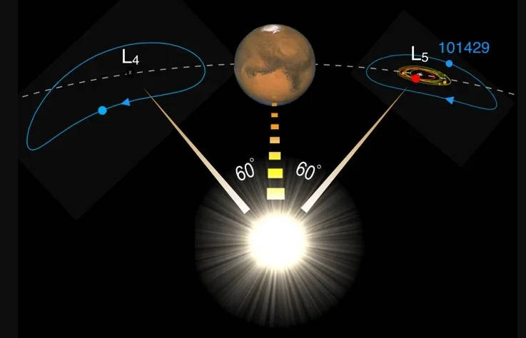 Mars and its Trojan asteroids including 101429 the asteroid that is spectroscopicly like the Moon. The other Trojans appear to have come from Mars itself. I tend to be a stickler for image accuracy: The Mars image is upside down and reversed, while the rest of the diagram is essentially correct other than being way out of scale. Credit Armagh Observatory and Planetarium (AOP) in Northern Ireland.